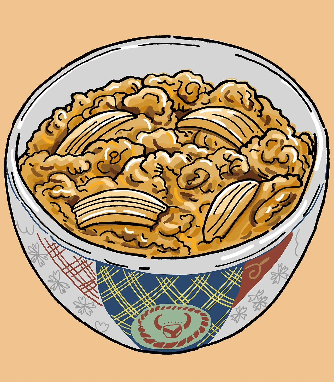 물에 간장, 설탕, 미림, 요리술 등을 넣고 거기에 얇게 썰은 우삼겹과 양파를 넣고 끓입니다. 그리고 그것을 밥에 얹어주는 요리입니다.