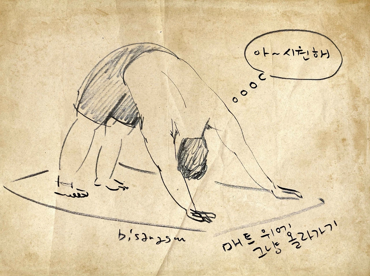 그리고, 태양경배 할 때 등이 쭉쭉 늘어나고 몸이 쫙쫙 펴지는 감각. 너무 좋다.