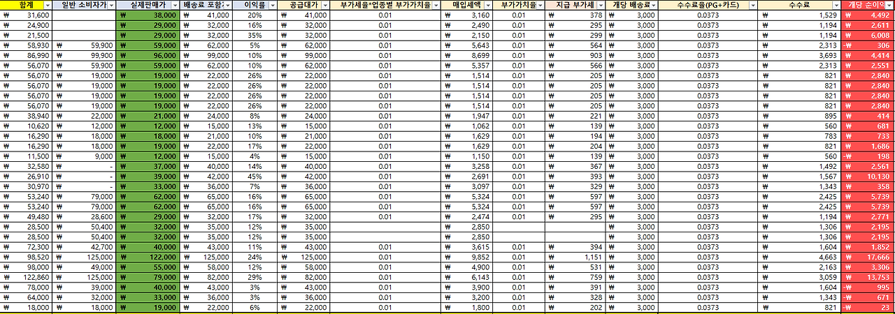 결론부터 얘기하면 원가 절감을 하지 않으면 수익이 발생하지 않는다. 심지어 몇몇 제품들은 팔면 손해가 나는 상황이 생겼다. 웃음밖에 안나왔다 진짜로. 표를 자세히 보면 붉은색 부분이 내가 물건을 팔았을 때 나한테 생기는 순수익을 나타내는데 맨 밑에 있는 세 개의 제품은 팔면 -가 발생한다. 진짜 이걸 보고 너무 웃겼다. 그냥 웃음밖에 안나왔다. 사실 뭐....처음이고...나름대로 노력은 했지만 이런 일이 발생할 것이라고 생각도 당연히 했지만 팔면 손해라는 말이 왜 생기는지 처음으로 알게됐다. 그래서 뭐 나름 재미있기도 했다. 저렇게 손해가 발생하는 이유는 딱 한 가지이다. 제품을 싸게 매입하지 못했기 때문이다.