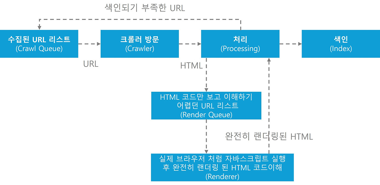 즉! HTML 코드만 봐서 검색엔진 크롤러가 "어? 이 페이지에 내용이 너무 없어서 내가 색인 후 검색하는 사람들한테 보여줄만한 가치가 없는데? 일단 랜더러 써서 나중에 한 번 살펴보자!"는 판단을 하는 순간 "랜더러"를 사용하는 프로세스로 넘어가게 됩니다. 이렇게 되면 검색엔진의 해당 페이지 색인이 없었기 때문에 모든 과정이 완료되기 전 까지 검색결과에서 우리 홈페이지가 나타나지 않게 됩니다.