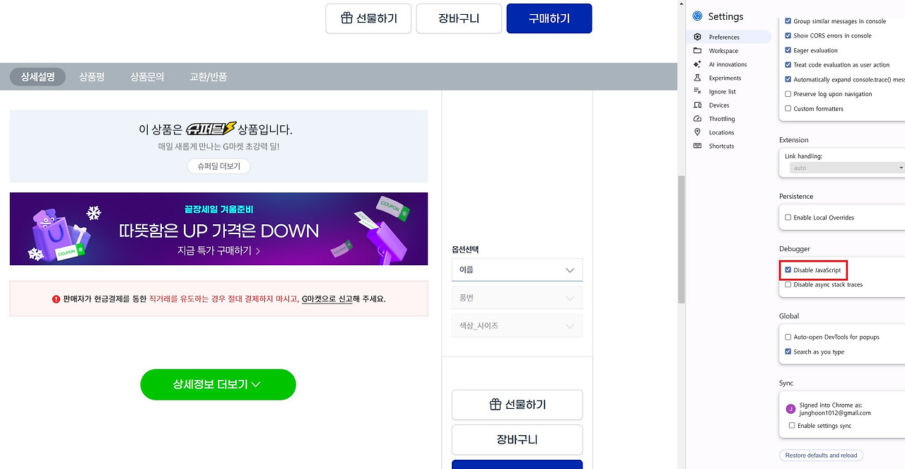 좌측은 고객들이 브라우저에서 보는 실제 사이트, 우측은 크롬 개발자 도구에서 "Settings(톱니바퀴)" > "debugger" > "Disable Javascrip"를 하고 확인한 페이집입니다. 두 화면 모두 같은 페이지를 보이고 있지만 자바스크립트 랜더러(Renderer)가 구현하는 부분을 제외하면 좌측에 있는 많은 내용들이 우측의 화면에서 보이지 않는 것을 확인할 수 있습니다.