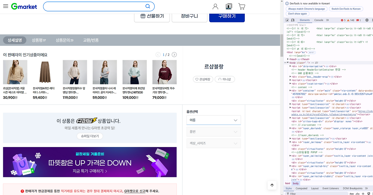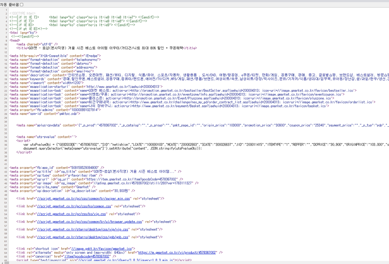 좌측의 이미지는 고객들이 브라우저를 통해 실제로 확인하는 페이지, 우측은 해당 페이지가 브라우저에서 구현되기 위해 설정한 HTML 코드입니다. 검색엔진은 수집된 URL 리스트에 크롤러를 출동시켜 우측의 이미지에 있는 HTML 코드를 이해하도록 명령을 내려놨습니다. 그러나 여기서 문제가 있습니다. 그 문제는 페이지를 제공하는 업체 입장에서 트래픽 부담을 줄이고, 웹페이지 내 좀 더 많은 마케팅 위잿등을 설정해서 보여주고 싶기 때문에 JavaScript를 통해 고객의 서버에서 구현될 기능들을 추가한 것이죠. 이런 원론적인 설명보다 직접 화면을 통해 보여드리겠습니다.