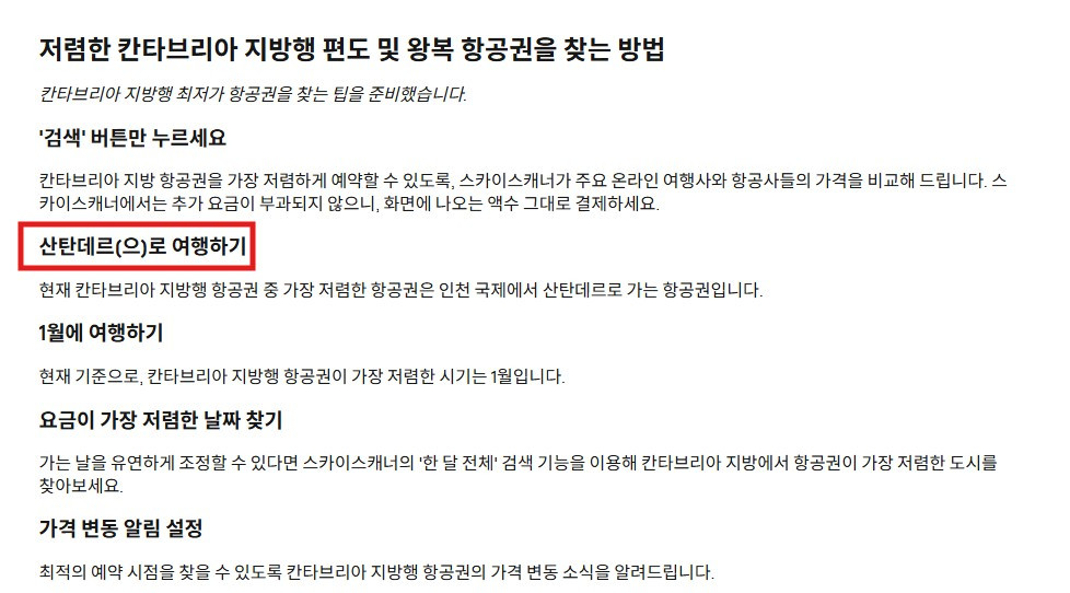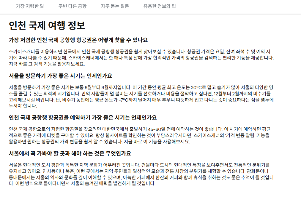 밑에 표에 있는 월평균 항공권 가격 역시 내부 데이터 연동을 통해 평균값이 저 위치에 표출되도록 랜더링 되어 있을 것 입니다. 모든 페이지마다 {도착지} 기준으로 데이터가 바뀔 수 있게 만들어 둔 것이죠.