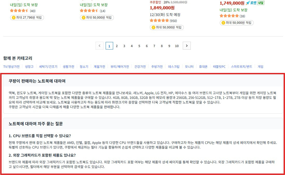 쿠팡의 경우 몇몇 카테고리 페이지 하단에 아래와 같은 콘텐츠를 추가해뒀습니다. 제품 카테고리에 따라 조금씩 템플릿을 최적화 해야 하지만 기본적으로 "{노트북 카테고리1}, {노트북 카테고리2}을 포함한 다양한 종류의 노트북 제품을 만나보세요." 같은 시나리오를 짜서 콘텐츠가 만들어지고 있습니다.