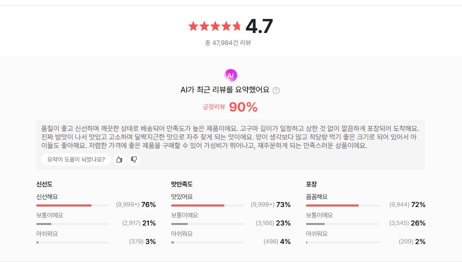 우선 첫 번째 SSG는 신선식품 카테고리에 한하여 AI 리뷰 요약을 제공하고 있습니다. 어떻게 생각하면 프로그래매틱 SEO의 가장 발전된 형태가 아닐까 싶습니다. 정해진 규칙에 데이터만 들어가면서 콘텐츠가 변형이 되는 것이 아니라 진짜 AI가 리뷰를 보고 요약하니까 진짜 자동화에 가깝다고 볼 수 있습니다.