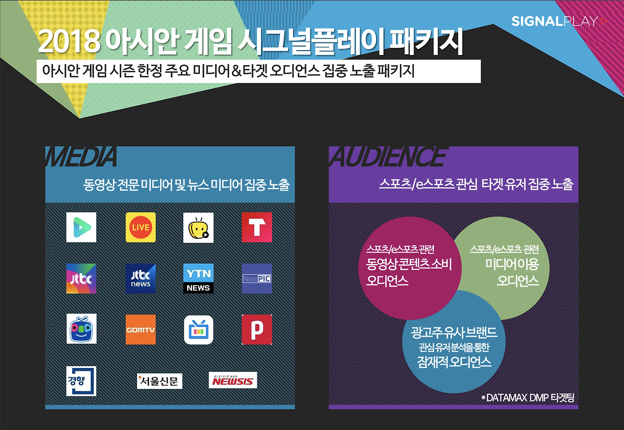 해당 자료에서 보는 것과 같이 아시안 게임이 열리는 주요 기간에 야구/축구/e스포츠/골프/펜싱/양궁/태권도 종목의 경기를 볼 수 있는 다양한 영상 플랫폼을 활용하는 광고상품이다.