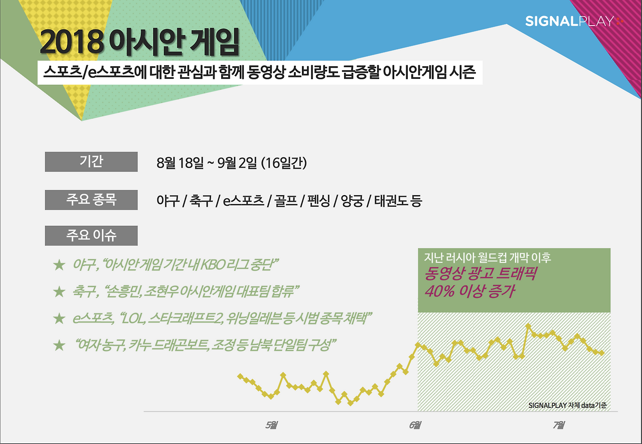 나름 사업 기획과 마케팅을 진행하는 담당자로써 다양한 미디어 랩사의 월간 리포트를 챙겨본다. 사실 엄청 자세히 보는건 아니고 그냥 훑어보다가 내가 좀 관심 있는게 있으면 조금 더 자세히 읽어보는 편이다. 미디어 랩사의 광고 리포트에는 네이버, 다음 그리고 유튜브, 페이스북 같은 주요 플랫폼에서 일어나는 변화와 광고 상품 그리고 성공적인 캠페인 사례들이 나온다. 또한 자사에서 새롭게 구성한 광고상품에 대한 단가와 세부 안내가 적혀있다. 올해는 월드컵과 아시안게임이 함께 있기 때문에 스포츠 판에서 나름 활용할 수 있는 이벤트가 많은 편이다. 그래서일까? 이번 아시안 게임에서 진행 될 일부 인기종목에 대한 광고 상품을 보면서 브런치에 이런 내용을 공유하고 싶었다. 자료의 활용에 문제가 있을까봐 미리 출처를 밝혀본다. 난 메조미디어, 나스미디어의 뉴스 리포트를 주로 살펴보는데 해당 자료는 메조미디어에서 배포하는 자료이다.