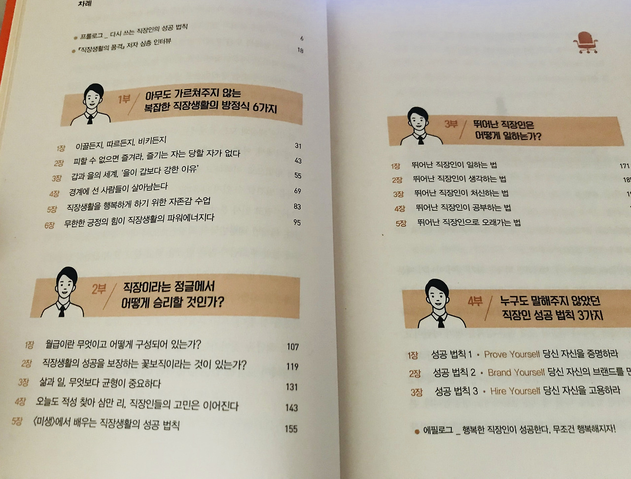 이렇게 몇 가지 눈에 띄는 문구들이 나에게 이 책을 사야 하나 말아야 하나 고민하게 만들었고, 술마실 때 3만 원짜리 안주는 아무렇지도 않게 시키면서 1.5만 원짜리 책 하나 사는데 고민을 하고 앉아있는 내 자신을 자책하며 구매했다. 이걸로 인해 내 회사 생활이 단 몇 시간이라도 버틸만하다면 그 값어치는 충분하다고 생각하며 말이다.