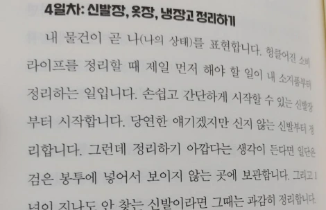 이 대목은 상당히 중요한 부분이었다. 서평에 이야기 했듯이 경제력은 단순히 돈을 잘 관리하는 것이 아니다. 내 물건, 내 삶의 습관 들이 곧 나이고 나의 상태를 표현한다. 헝클어진 소비 라이프를 정리할때 제일 먼저 해야하는 것은 소지품을 정리하는 일이다.