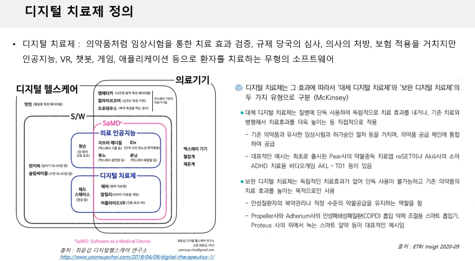 의약품처럼 임상시험을 통한 치료 효과 검증, 규제 당국의 심사, 의사의 처방, 보험 적용을 거치지만 인공지능, VR, 챗봇, 게임, 애플리케이션 등으로 환자를 치료하는 무형의 소프트웨어
