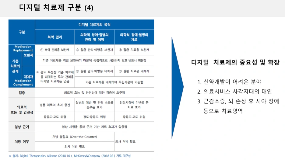 그리고 디지털 치료제의 유형은 크게 두 가지(대체제, 보완제)로 구분되지만 약간은 세밀하게 세 가지 유형으로 분류할 수 있다.