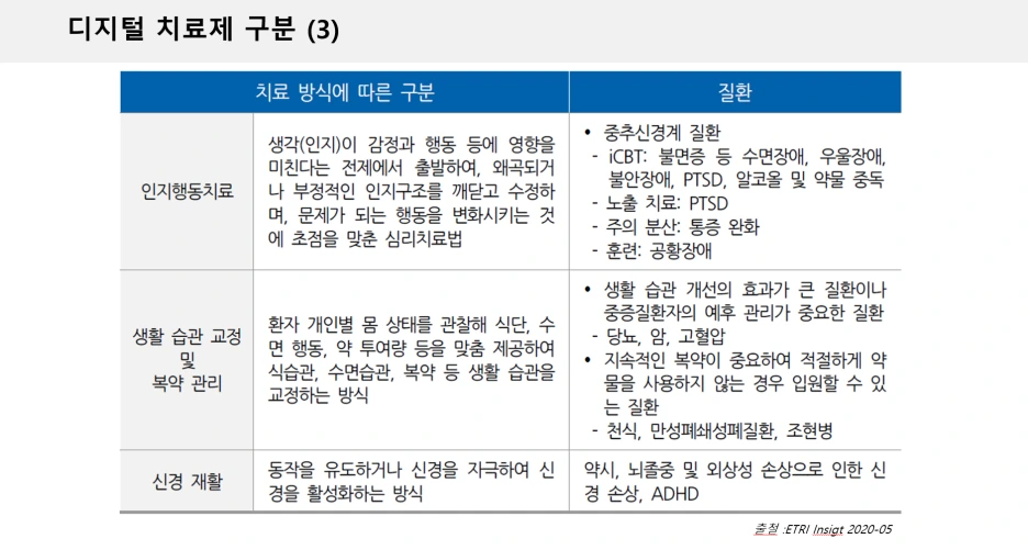 디지털 기술을 활용하여 주로 쓰이는 치료 방식에서 보면 인지치료, 생활습관 교정 및 복약관리, 신경 재활 등에 사용되고 그 유형은 다음과 같으며 타깃 질환은 아래 디지털 치료제 구분(3)에 잘 정리되어있다.