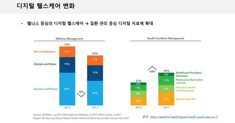 아래의 왼쪽 그림은 웰니스 중심의 헬스케어는 2015년 대비 2017년에는 13% 감소를 하였고, 반대로 질환을 관리하는 분야는 48% 성장을 보였다. 지금 2022년에는 더욱 질환을 관리하고 치료하는 분야의 중심에 디지털 치료제가 있다고 본다.