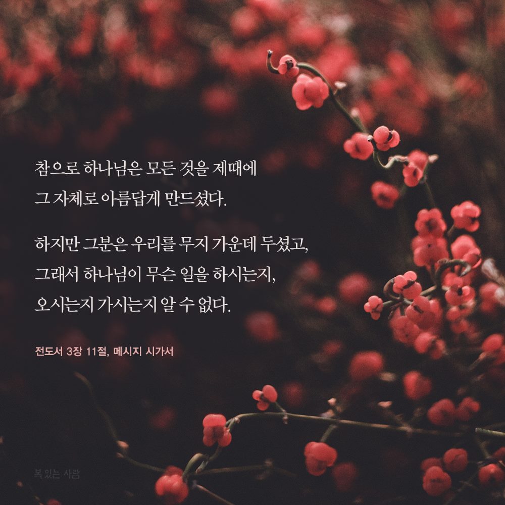11절) 하나님은 모든 것을 지으시고 때를 따라 아름답게 하셨고, 사람들에게는 영원을 사모하는 마음을 주셨습니다. 인생의 짐짝 같은 노고가 왜 내게 가장 맞는 세팅일까요? 이것이 하나님께 우리를 돌이키게 하기 때문인데요, 이 사건으로 어쩔수 없이 하나님을 찾고 돌아오기 때문입니다. 이렇기 때문에 마음 중심이 하나님이 계시게 되고, 영원을 사모하게 됩니다.