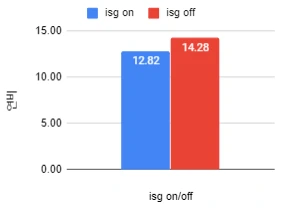 ISG를 켜고 운행한 평균 23일간의 연비보다, ISG 끄고 운행한 연비가 약 11% 가량 높았다. (14.28 km/l)