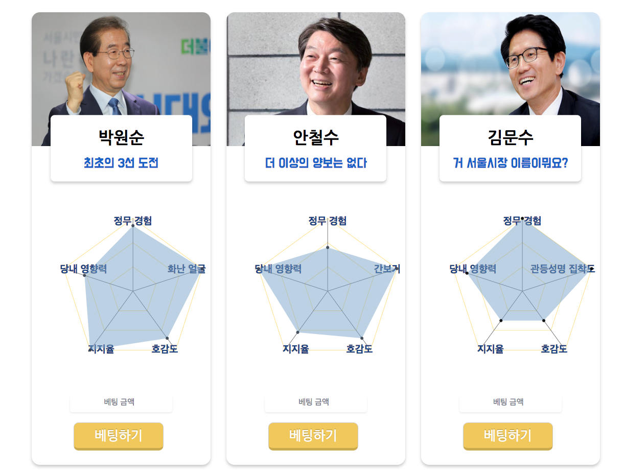 만약 이런 비이성적인 활동에 작은 재미를 심어주면 어떨까요. 후보들에게 베팅을 하고 결과에 따라 수익이 생긴다면 훨씬 재밌지 않을까요? 로또 한 장을 쥐고 일주일을 버티는 소시민 중 하나로써, 이번 지방선거에 그런 기대감을 품을 수 있다면, 덩달아 투표할 마음도 생길 것 같았습니다. 그리고 이렇게 이끌어낸 작은 참여들이 사회를 긍정적으로 바꾸어 가리라 생각했습니다.이런 생각에서 나온 서비스가 CryptoDemocracy 입니다.