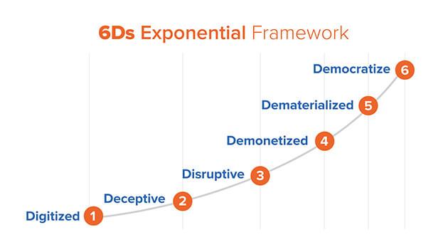 피터 디아만디스와 스티븐 코틀러는 그들의 공동저서 <BOLD>에서 기하급수의 성장을 보이는 현대 기술 진보의 과정을 6D로 압축하여 설명하였다.