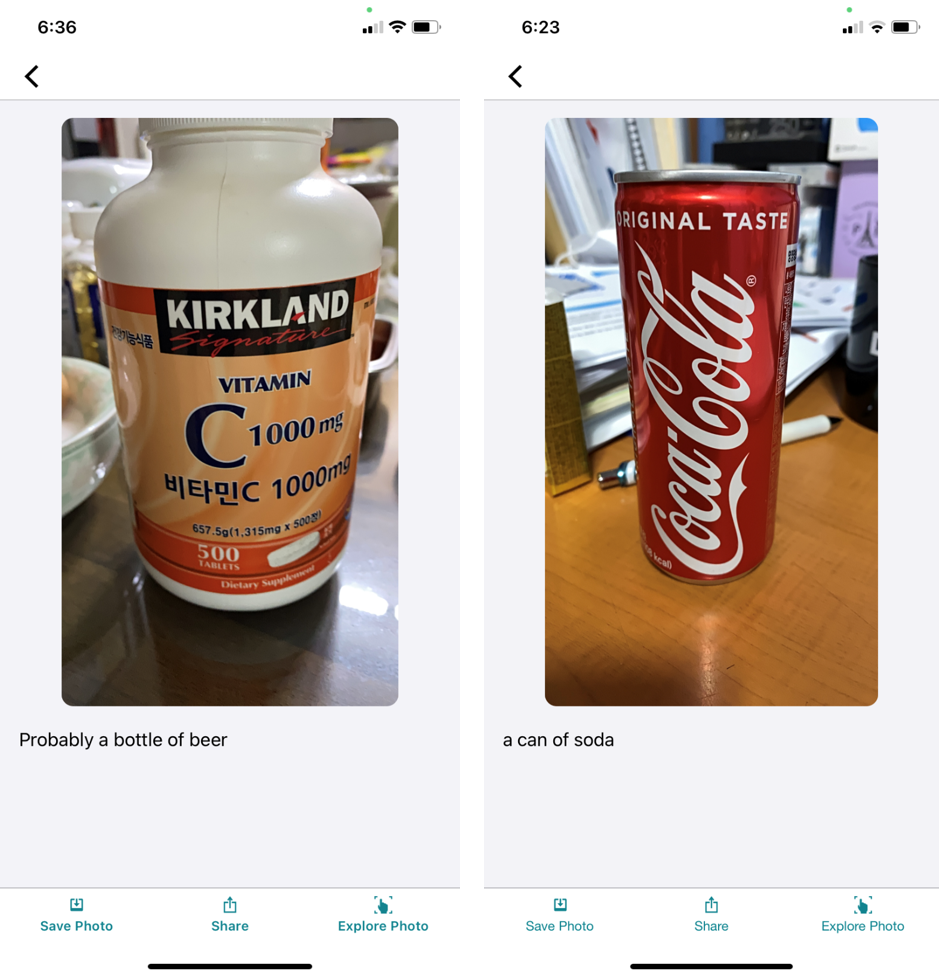 또다른 룩아웃의 문제점은 사물의 상세 정보가 아닌 카메라에 잡힌 이미지 묘사에 그친다는 점이다. 구체적인 상황 설정을 위해 우리 주변에 있는 수많은 상품들을 예시로 들어보자. 비장애인의 경우 상품을 표지만 보고도 구분할 수 있다. 내 손 안에 있는 음료수 캔이 코카콜라인지 펩시콜라인지 바로 알 수 있다. 그러나 시각장애인은 각기 다른 표지들을 보지 못 한다. 이들에겐 손 안의 음료수 캔이 어떤 상표인지, 무슨 맛인지, 용량은 얼마나 되는지 등의 정보를 원한다. 그러나 룩아웃은 아직까지는 상품 이미지 스캔만으로는 이러한 정보를 제공해주지 못한다. 아래의 사진 예시를 보면 알 수 있듯이, 룩아웃의 AI는 상품을 상품으로 인식하지 않고 사물 그 자체로 인식한다. 첫번째 사진에서는 AI가 비타민C 용기를 모양이 흡사하여 맥주병으로 오인했다. 두번째 사진에서는 세상에서 가장 유명한 탄산음료인 코카콜라마저 그저 "탄산음료 한 캔"으로 묘사한다. 틀린 정보는 아니어도, 시각장애인들이 원하는 정보는 아니다.