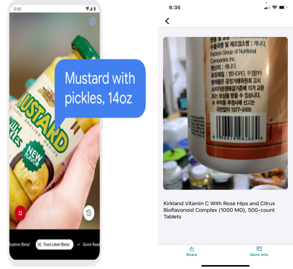 AI가 상품의 이름과 정보를 잘 말해주는 경우도 있다. 표지에 상품명과 상세 정보가 잘 나와 있는 경우에 말이다. 아래 왼쪽 사진을 보면 AI가 상품 표지의 "머스타드"라는 텍스트 정보를 읽어 상품명과 용량까지 말해주고 있다. 이 경우는 그러나 이미지 인식이 아니라 텍스트 리딩이다. 표지에 텍스트 정보가 없거나, 캘리그라피와 같은 디자인적 요소로 상품명을 AI가 읽기 힘든 경우에는 인식하지 못한다. 물론, 이 문제는 구글의 데이터베이스가 빈약해서 생기는 문제는 아니다. 상품의 바코드만 인식시킬 수 있다면 이 문제는 해결된다. 아래의 오른쪽 사진에서, 위 예시 사진과 동일한 비타민C 용기의 바코드를 인식시키자 이에 대한 정보가 바로 출력되는 것을 알 수 있다. 그러나 상품의 바코드 위치를 시각장애인들이 항상 아는 것은 아니다. 바코드를 찾으려고 상품을 이리저리 스캔해야하는 수고에 시간도 더 걸린다. 비장애인들은 한 눈에 알 수 있는 정보를 표지 이미지 스캔으로 한 번에 알 수 없다는 것은 룩아웃이 해결해야 할 큰 숙제다.