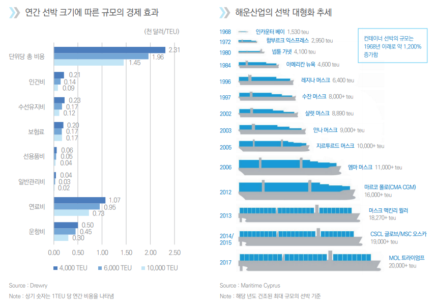2번과 3번은 맞닿아 있는 개념이기에 같이 살펴보겠다. 글 초반에 해운 서비스의 차별화가 쉽지 않기에 원가 절감을 위한 규모의 경제가 중요함을 말했다. 해운 동맹은 특정 항로의 선복 과잉을 막기 위해 운임경쟁을 배재하기 위해 맺은 카르텔이다. (공공연하게 인정됨) 동맹으로 해운사들은 한 회사인 것처럼 선복, 물류망을 공유하여 서비스 범위를 확장하고, 공동영업으로 화물 확보가 용이하며 원가를 절감할 수 있다. 현재는 크게 3개의 동맹 체제가 형성되어있다. 또한 선박이 대형화됨에 따라 그 단위당 총 비용이 급격하게 줄어든다.