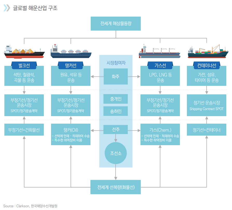 옆 사진 내 선박의 구분은 운송하는 화물이 무엇이고, 대상 고객이 누구냐에 의해 발생한다. 벌크선, 탱커선, 가스선은 원부자재 및 에너지를 소수의 고객으로부터 대량의 화물을 인수해 운송한다. 반면 컨테이너 운송은 완성품을 다수의 고객으로부터, 다양한 종류의 소량 화물을 집화하여 운송해준다. 컨테이너 해운은 정기선으로 정해진 항로, 일정, 운임으로 화물이 많든 적든 떠나는 구조다.