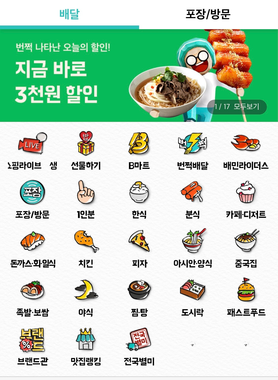 배달의 민족 홈 화면 우버이츠 카테고리 화면