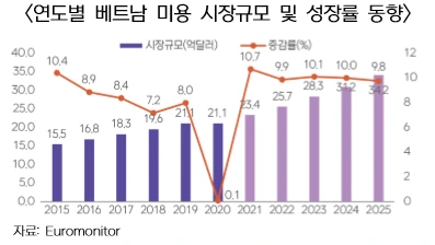 우측의 그래프는 베트남 미용시장 규모와 성장률을 나타낸다. 코로나 직후, 시장성장세가 잠시 주춤했지만 2021년을 기점으로 다시 급등하며 약 10.7%의 성장률을 보였다. 향후 5년간 10% 안팎의 높은 성장세가 이어질 것으로 보인다. 베트남의 높은 경제성장률에 힘입어 미용에 대한 욕구는 나날이 늘어나고 있다.