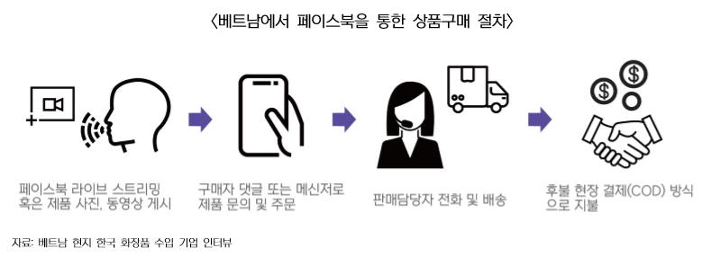 베트남의 화장품 구매는 페이스북, 인스타그램 등 SNS를 통해 활발하게 이뤄진다. 이 방식은 인플루언서의 라이브, 혹은 게시글을 통한 구매대행 방식이다. 다만 구매대행 수수료가 붙는다. 이후 배송이 완료되면 현장에서 결제하는 방식으로 이뤄진다. SNS 구매의 본질은 '신뢰'이다. 자국 화장품 시장을 믿을 수 없으니, 인플루언서 개인을 믿어볼 밖에. 그러나 우리도 알다시피 라이브의 대부분은 광고성이 짙다. 그래도 어쩌겠는가, 가품이 판치는 시장보다는 이름값을 믿는 게 나은 대안이니까.