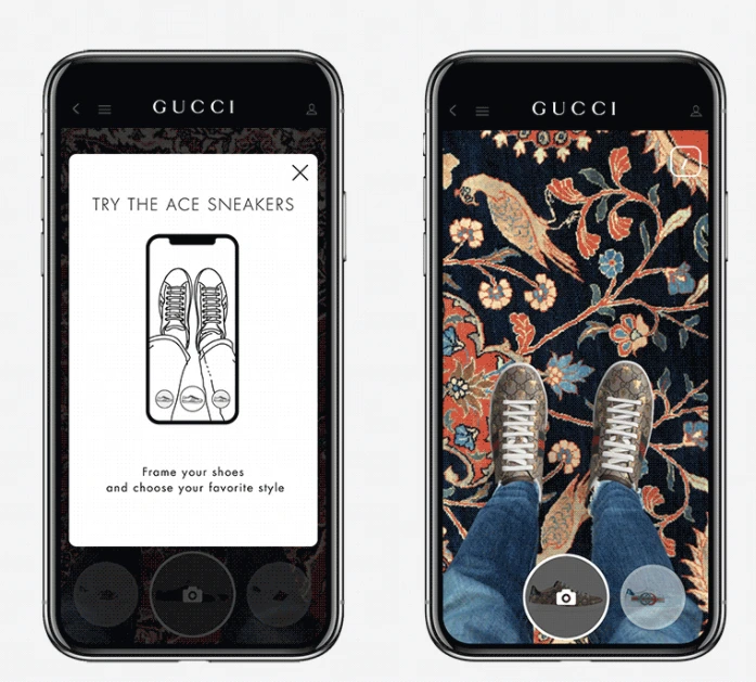 구찌의 앱도 마찬가지로 운동화 피팅 서비스를 제공한다. 고객이 원하는 신발을 선택한 후 카메라로 발을 비추면 운동화를 가상으로 착용한 모습이 화면에 보여진다. 이러한 아이템들은 메타버스 속 아바타의 아이템과도 연결지을 수 있다. 구찌가 가상 전시를 통해 판매한 가방은 실제 가방보다도 비싸게 팔렸다. 나이키와 루이비통 등도 메타버스 플랫폼 안에서 아이템 자체를 팔거나, 아이템과 같은 실제 옷을 현실에서 팔고 있다. 현대자동차에서는 제페토에 전시관을 열고 이용자가 아바타로 간접 시승체험을 할 수 있도록 했다.
