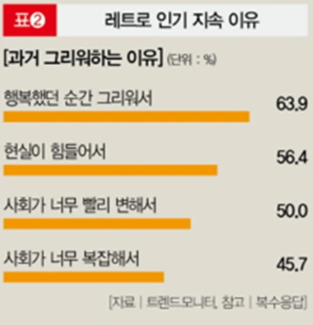 오늘날 청춘은 바쁘다. 그리고 아프다. 평생 직장, 내 집 마련, 단란한 가족. 타고난 수저가 아니면 이루기 어려운 현실이다. 그러니 경험한 적도 없는 과거가 아름다울 수 밖에. 트렌드 모니터에 따르면, 레트로 인기의 이유로 ‘현실이 힘들어서’가 56.4%로 2위를 차지했다.