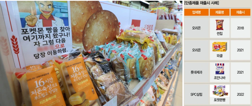 단종된 빵이 재 출시되는 일은 최근 제과업계에서 빈번하다. 2021년에는 오리온의 ‘와클’이 재출시 되어 출시 5주동안 180만개가 넘게 판매되었다. 특히 이 재출시는 소비자가 직접 회사 게시판 등을 통해 꾸준히 요청해 이루어졌다. 단종되기 전보다 약 2배 가량 높은 매출을 보이며 성공적인 재 출시 사례로 평가받는다. 이 뿐만 아니라 지난 2018년에는 ‘태양의 맛 썬’을, 2019년에는 ‘치킨팝’을 다시 선보이며 많은 인기를 끌었다.