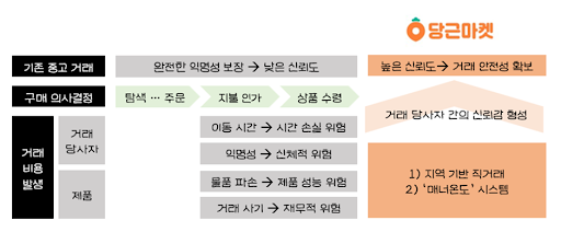 딩근마켓은 이러한 문제점을 1) 지역 기반 2) 직거래 중심이라는 중고 거래 플랫폼의 새로운 패러다임을 내세우며 타파하였다. 당근마켓은 소비자가 지각하는 3) 거래 상대에 대한 불안감에서 가장 크게 인지하는 신체적 위험과 4) 제품에 대한 위험을 ‘근거리 거래’와 거래후기로 평가되는 ‘매너온도’ 시스템을 이용하여 상쇄하고 있었다. 당근마켓 이용자를 대상으로 온라인 중고거래를 하는 동기를 확인한 IDI 연구에서 이용자들이 당근마켓이 다른 중고거래 사이트와 비교되는 가장 큰 차별점을 ‘안전성’으로 꼽았다는 결과는 당근마켓의 이러한 전략이 성공했음을 단적으로 보여준다. 인터뷰 대상자들은 “동네 주민끼리 거래하는 것이고, 직거래다 보니 사기 확률이 낮다”고 응답하는 등 거래 당사자 간의 신뢰감 형성에 따른 거래의 안전성을 강조하였다. 이는 소비자들이 지역 커뮤니티 내에서 인근 주민들과 형성하는 내적 친밀감을 바탕으로 거래를 하기 때문에 신뢰감을 형성할 수 있고, 만약 거래 당사자 중 어느 한 쪽이 의도적으로 상대방에게 피해를 주는 경우, 해당 지역 커뮤니티 내에서 배척당할 수 있다는 심리적 두려움이 결합된 결과로 추론해 볼 수 있다. 이렇듯 당근마켓은 소비자들이 중고 거래 시장에서 가장 크게 느끼는 페인 포인트를 1)과 2)의 키워드로 상쇄하며 2021년 1월 기준 중고 거래 어플리케이션 사용자 순위에서 2위인 번개장터의 약 5배에 달하는 1094만 명의 유저 수를 기록하며 국내 중고거래 시장을 선도하고 있다.