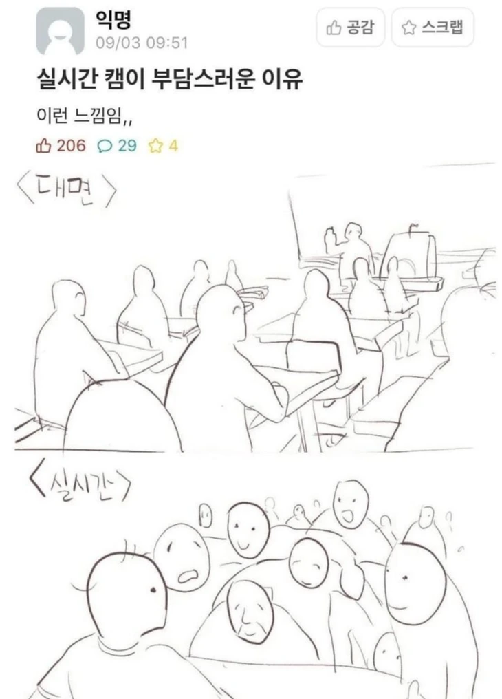 결국, Zoom같은 영상통화 기반의 수업은 다양한 이유로 소통의 효율이 떨어졌다. 인간은 상대의 표정을 다양한 각도에서 무의식적으로 인지하지만, 2D로 이뤄진 화면은 우리의 지각을 어지럽히고 반응을 읽기 어렵기 때문이다. 혹은 화면 속 상대방의 모습보다 자신의 모습을 더 많이 쳐다보는 경향이 있어 계속해서 나의 모습에 신경을 쓰게 되고, 이런 부담감을 없애기 위해 캠을 끄면서 집중도와 참여도가 떨어지는 결과가 생기는 것이다.