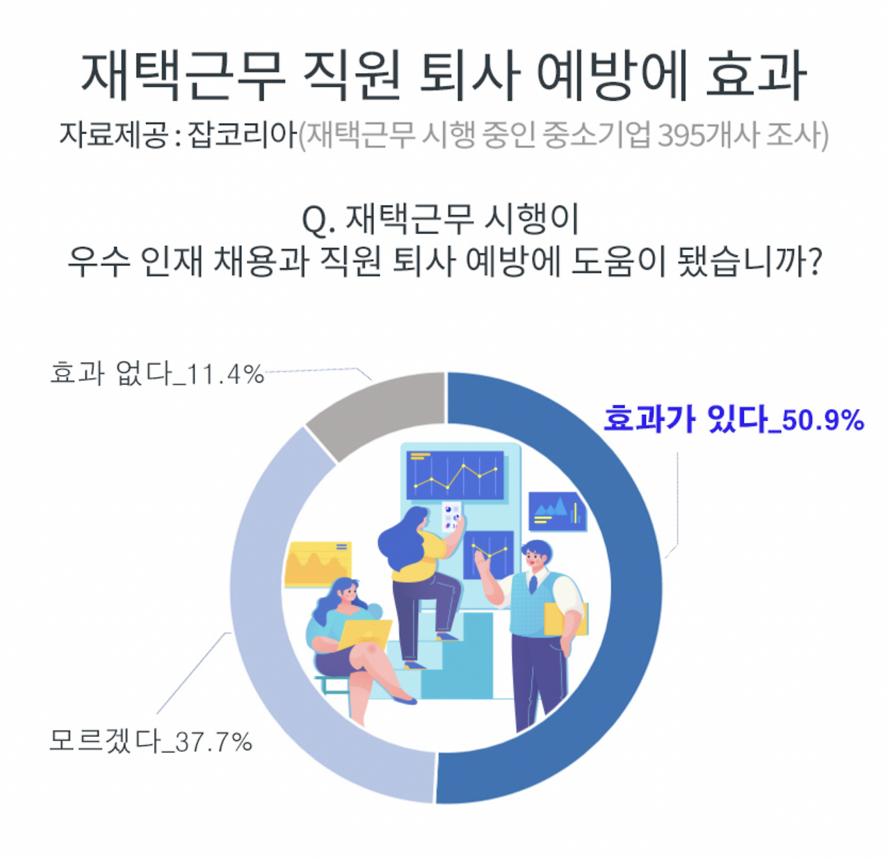 잡코리아에서 진행한 '코로나 엔데믹 전환에 따른 재택근무 유지 계획' 설문조사에서 약 40.6%의 기업들이 재택근무를 유지하는 이유로 '임직원이 선호하는 근무 형태이기 때문이다'를 선택했다. 또한 50.9%는 '인재 채용 및 퇴사 예방에 효과가 있다'고 답했다. 결국 회사 운영 측면에 있어 회사의 입장이 고려되어야 하나, 회사를 구성하는 직원들의 근무 희망 여부도 어느정도 고려되어야 하는 것이다.