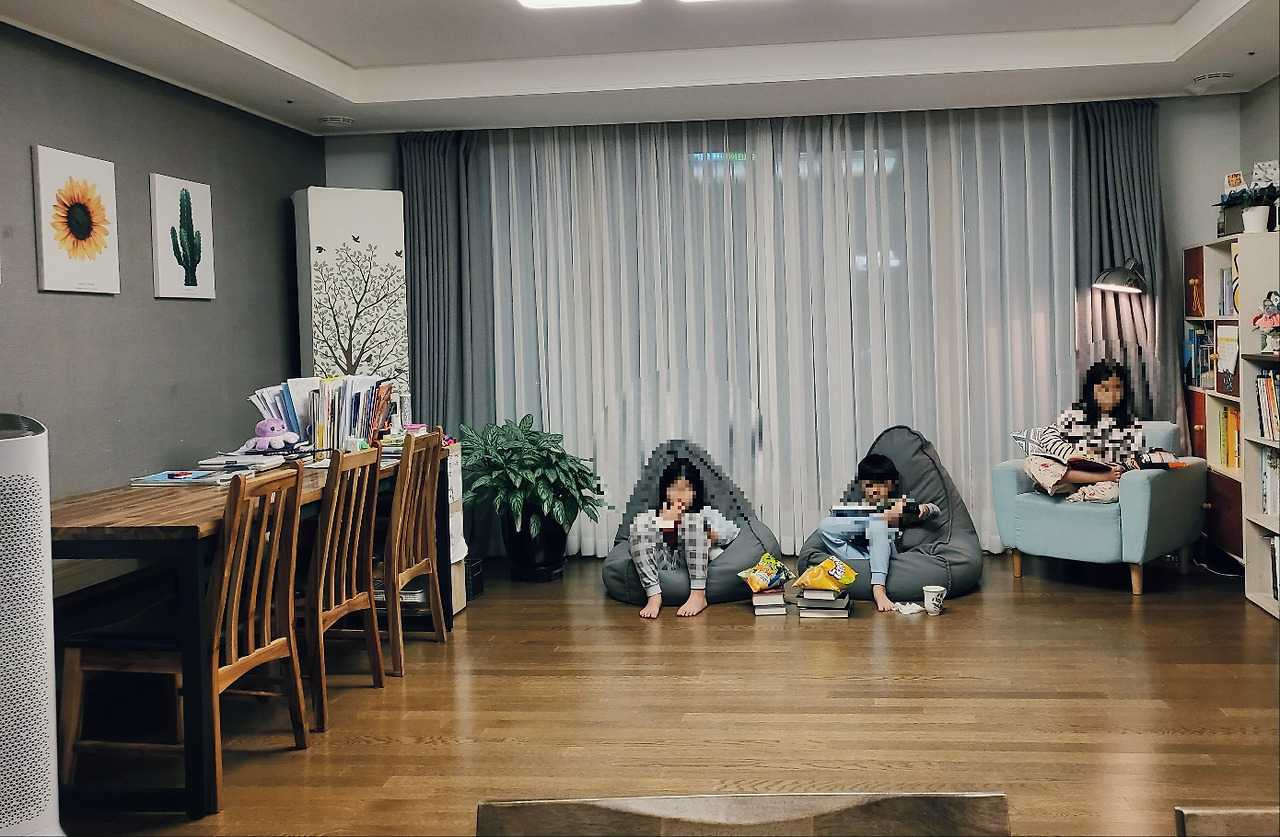 거실에는 TV 대신 책장이 있다. 책상도 있고, 막내 레고도 놓여 있다. 거실은 이제 아이들이 책을 읽고, 놀이도 할 수 있는 '지식 놀이터'로 변했다. 그리고 그 변화가 정말 재미있게 일어난다. 내가 책을 읽으니까, 아이들도 자연스럽게 책을 읽기 시작했다. "책을 읽자"라고 말하기 전에, 내가 먼저 책을 읽는 모습이 아이들에게 영향을 미친 것이다.
