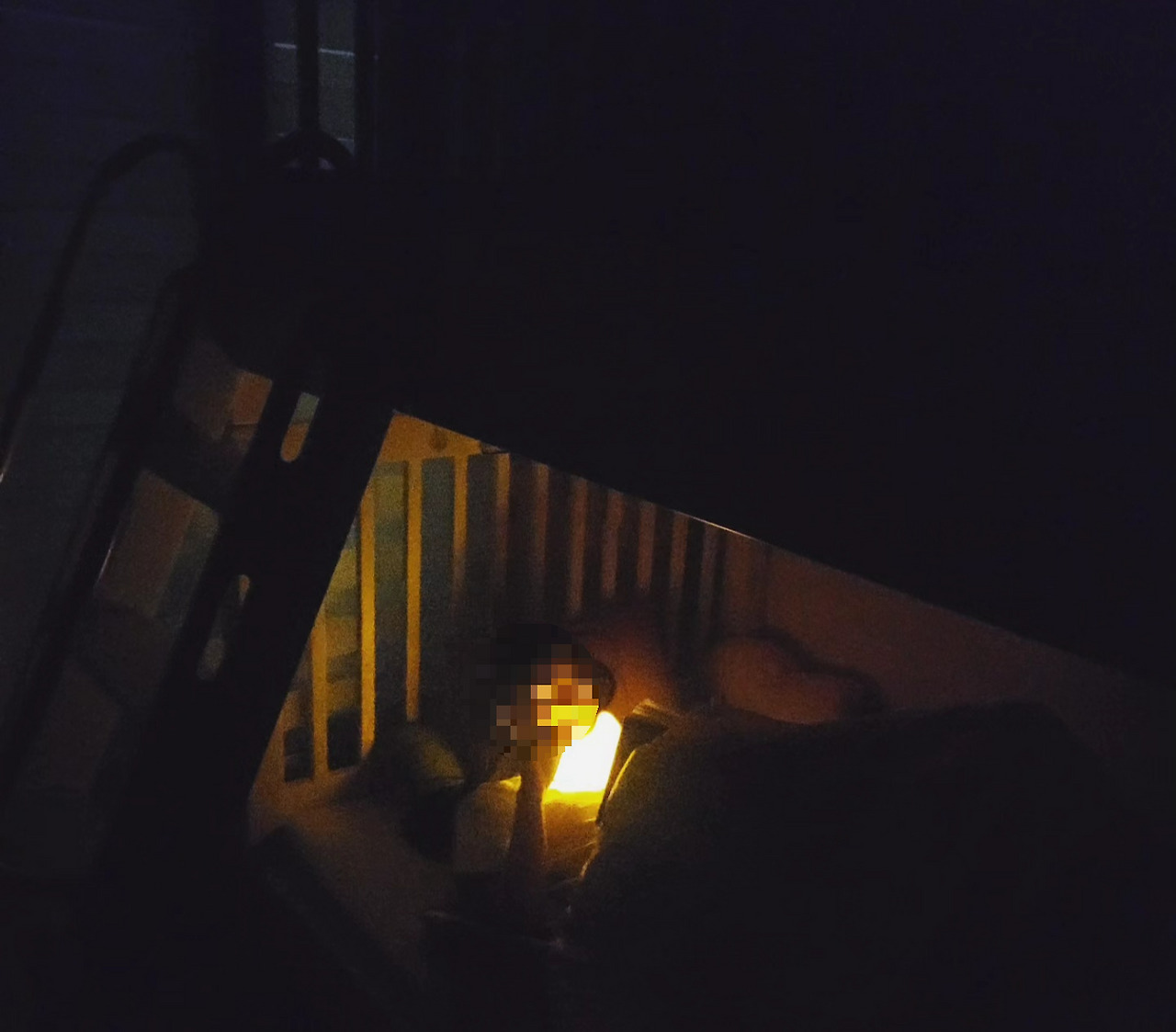 손전등으로 몰래 독서하다 들킨 큰아이. 사진 찍으니 브이.