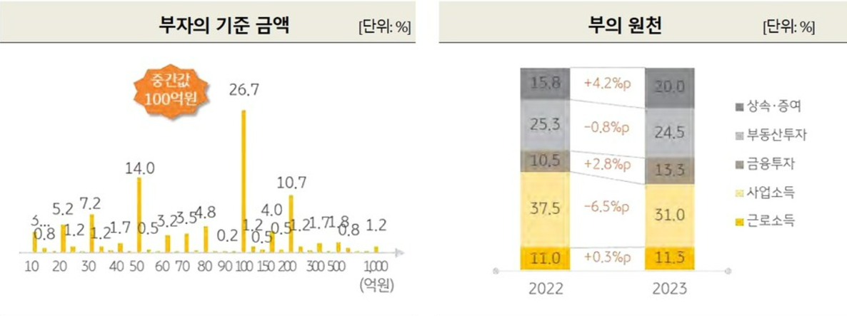 부자들이 어떻게 자산을 모았는지, ‘부의 원천’을 보면, 사업소득(31%)이 기여도가 가장 컸다. 이어 부동산 투자(24.5%), 상속·증여(20%), 금융투자(13.3%), 근로소득(11.3%) 순으로 자산 축적에 기여했다.