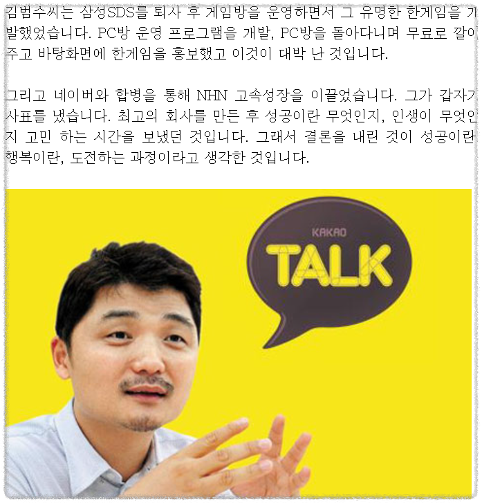 "우리나라 최고의 부자는 너도 잘 알겠지만, 삼성전자 이재용 회장이야. 그리고, 우리나라 부자 순위 안에 드는 인물들 중에 네가 생각하는 의사나, 대기업 직장인은 없단다. 흥미로운 사실 하나는, 6위에 카카오톡을 만든 김범수라는 사람이야. 지금 뉴스에서 굉장히 시끄럽긴 하지만, 그 사람은 컴퓨터가 좋아서 카카오톡까지 만든 사람이기도 해'