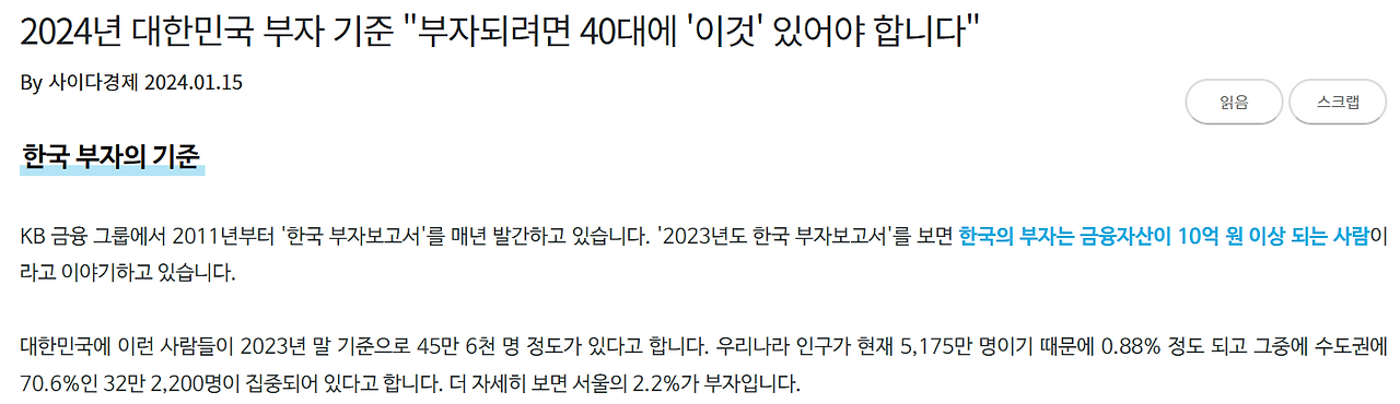 그러나 10억이 있어도, 사람들은 부자의 기준으로 자산이 100억 원 이상 있어야 진짜 부자로 인식한다는 결과가 나왔다.