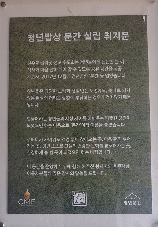 청년들을 위한 식당이 있으면 좋겠다. 우리가 세상과 청년들 사이에 위치하면서, 문간방처럼 다시 세상으로 나가는 곳이 되자.