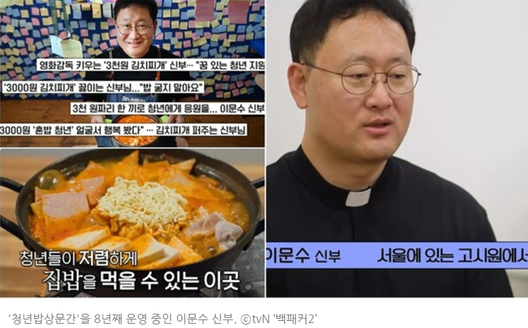 ‘청년밥상문간’을 운영하는 이문수 신부님은 몇 년 전, 서울의 한 고시원에서 한 청년이 굶주림으로 세상을 떠났다는 안타까운 사건을 계기로 청년들을 위한 식사를 제공하는 공간을 마련하셨습니다. 현재 정릉 본점을 포함한 이화여대 등 5개 지점을 운영하며, 물가 상승에 따라 비수기에도 손님이 두 배로 늘었다고 합니다. 저렴한 가격 때문에 맛이 떨어질 것이라는 편견은 버리세요. 이곳은 이미 김치찌개 맛집으로 입소문이 난 곳입니다.