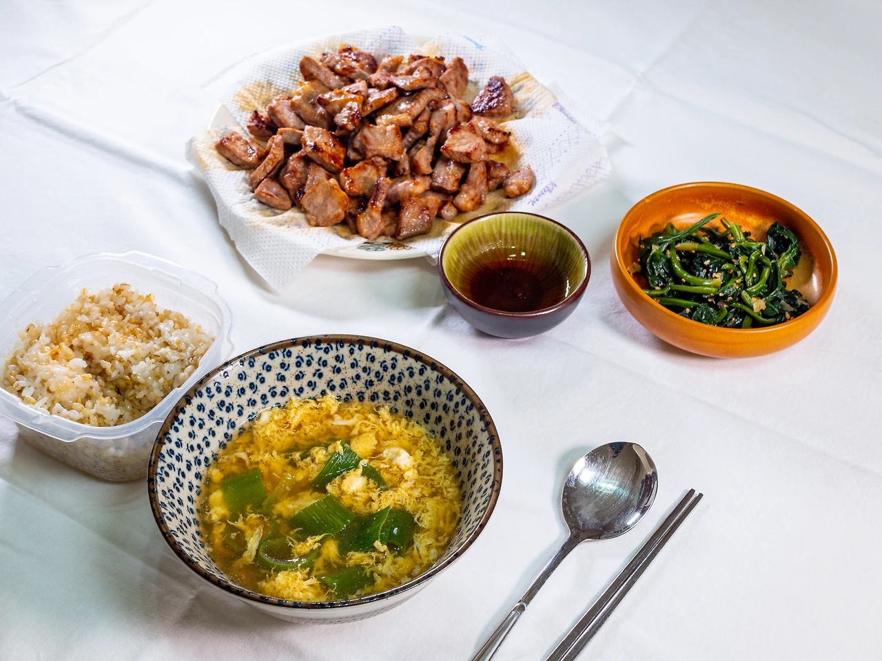 첫 번째 끼니 - 밥, 달걀국, 시금치무침, 그리고 돼지고기 목살구이