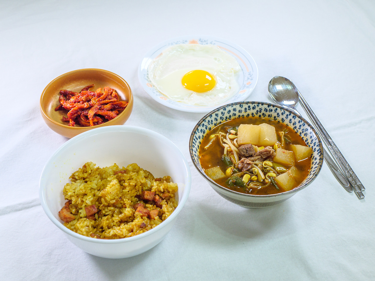 여섯 번째 끼니 - 카레볶음밥, 경상도식 소고기뭇국, 달걀프라이, 무말랭이