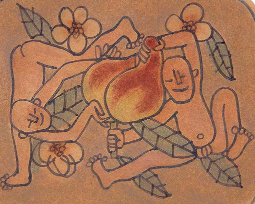 담배를 싼 은박지에 그린 작품과 아이들에게 엽서로 복숭아를 먹이는 아버지의 재치에 마음을 뺏겼다. 조롱박처럼 생긴 큰 복숭아를 가운데 두고 발가벗은 아이들이 활짝 웃으며 껴안고 즐거워 하는 모습은 그의 어린 시절을 상상하게 했다. 복숭아는 새들도 좋아해 밭 옆에 뽕나무를 심는다. 새들이 복숭아를 먹으려다 오디를 먹으러 가기 때문이다. 복숭아와 뽕나무, 복뽕 세트다.