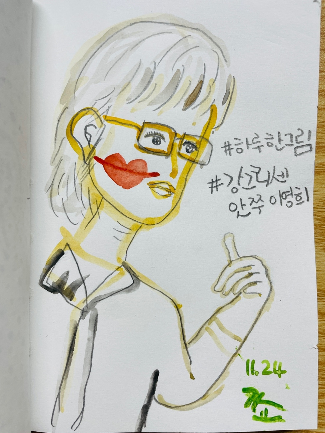 어제밤 11시 서방하고 영화 프렌치 디스패치를 보러 갔다. 그랜드 부다페스트 호텔이나 문라이즈 킹덤을 만든 웨스 앤더슨 감독 작품이다. 화가인 베니시오 델토로가 홀딱 벗고 서 있는 누드 모델 레아 세이두를 캔버스에 그리는 장면을 보고 잠이 들었다. 잘 자고 있는데 서방이 왼쪽 옆구리를 난대없이 쳐서 놀라 깼다가 다시 숙면으로 향했다. 서방 왈, 내가 코를 골았다나, 조용한 장면에서 코를 골아서 사람들한테 방해가 됐다는 믿을 수 없는 얘기를 했다. 나는 그런 여자가 아니라고 정해놓고 지금껏 살아왔다. 아무튼 집으로 오면서 영화 한 장면이 머리에서 떠나지 않았다. 홀딱 벗고 우아하게 서 있는 레아 세이두를 보면서 베니시오 델토로가 그림을 그렸는데 캔버스에는 그냥 한무더기 붉은색만 있었다. 추상화였다. 일단 레아의 올누드에 충격이고 결과물이 반전이었다. 아 맞다. 그림 수업을 받은 첫날 선생님이 그랬다. 그림은 생각을 표현하는 것이라고 했다. 서툴러도 용기를 주신 좋은 선생님 얼굴에 장난을 했다. (그런데 영화는 무슨 내용인지...^^)
