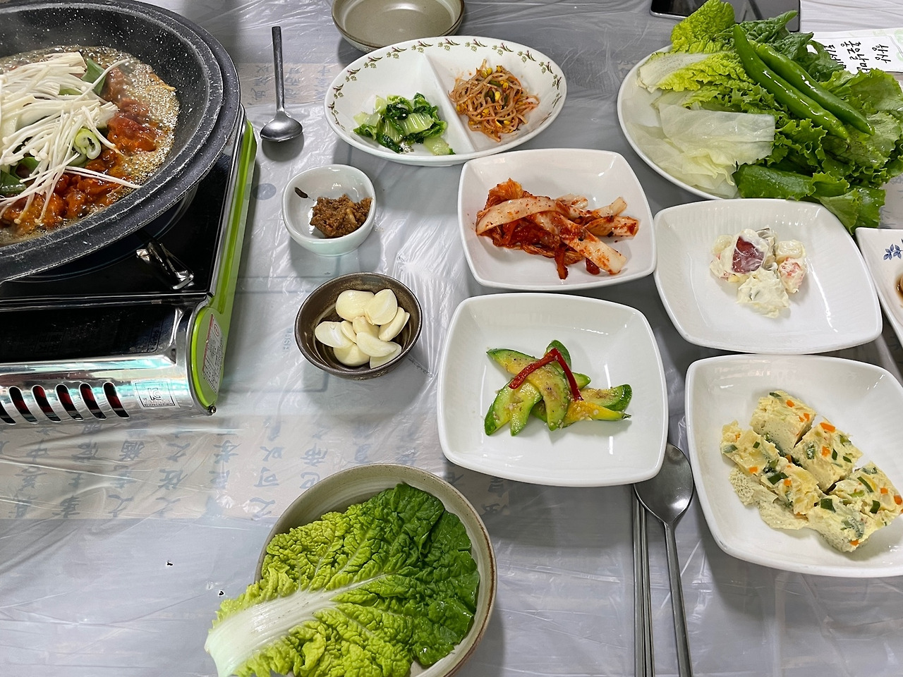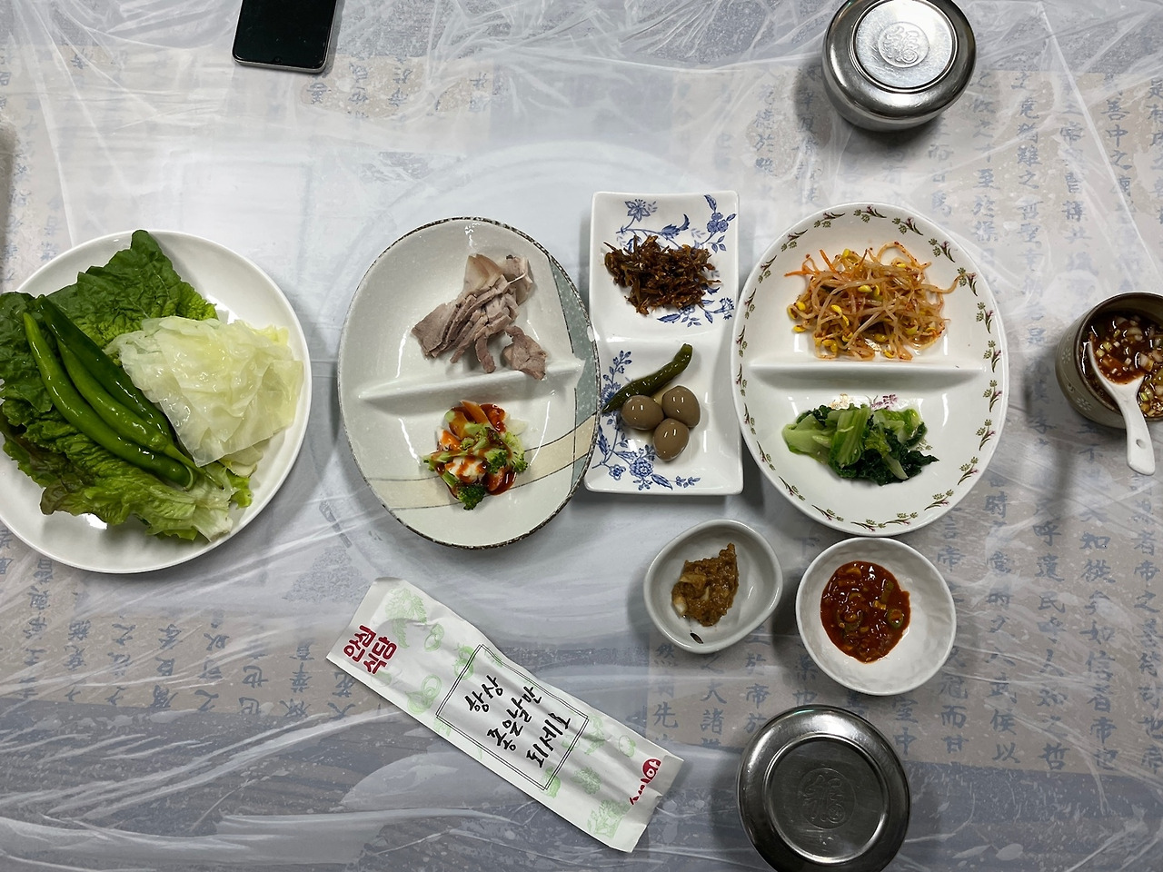 주방에서 당당하게 앞치마를 두르시고 딱딱한 눈빛에 얇은 미소를 띤 식당 사장님이 내어주신 반찬은 8천원짜리가 맞나? 주문을 잘못 들으신게 아닐까 싶어 재차 확인했다. 소처럼 배추잎, 상추잎을 입 안 가득 넘기며 빈 속을 채우고 김제덕 선수 큰어머니임을 알아차려드리게 인사를 하고 잘먹었다고 했다. 내가 돌본 조카가 세계를 제패했으니 동네방네 자랑스러움을 입으로 말하지 않고 반찬으로 담아내신 것 같았다.