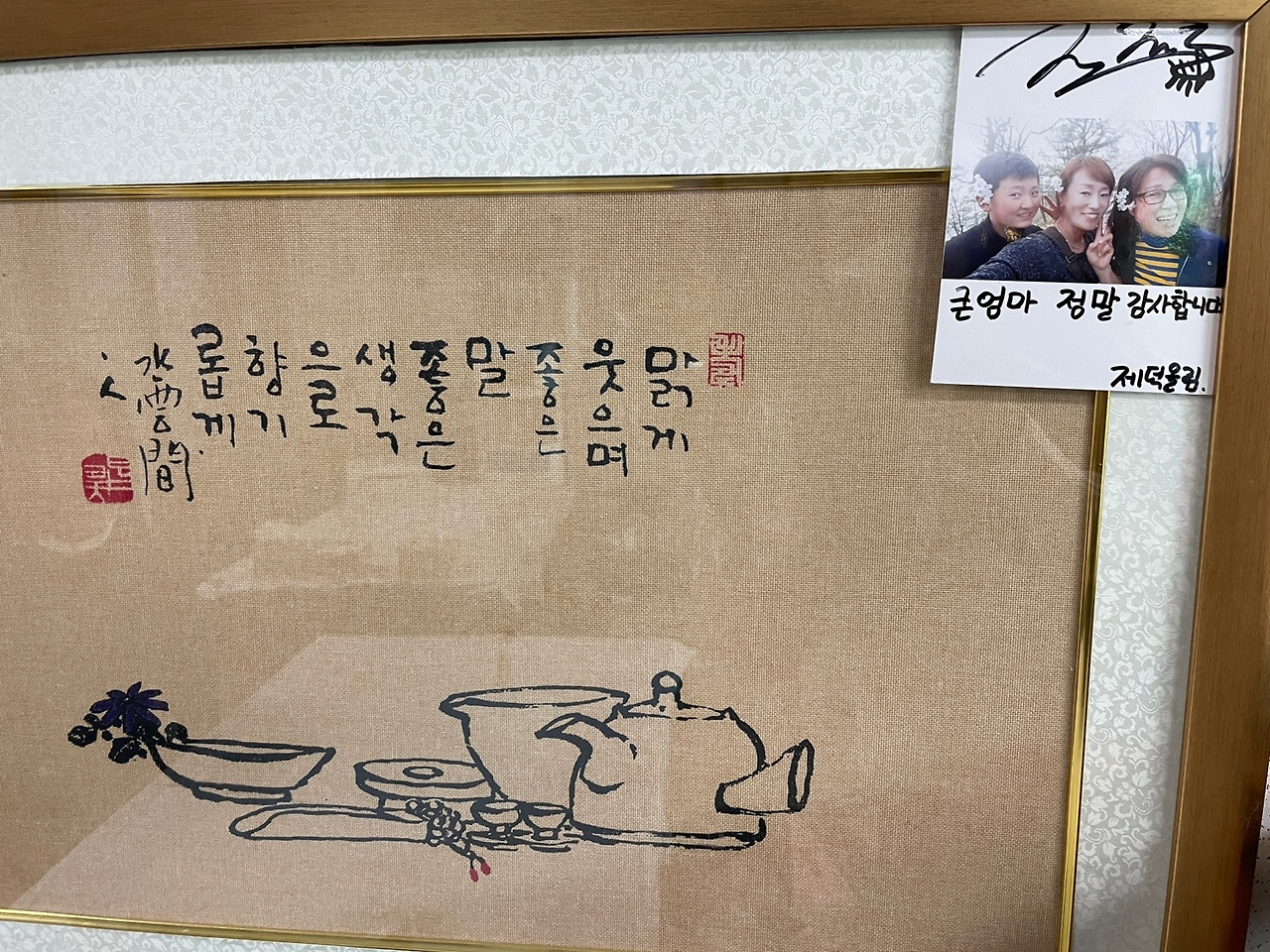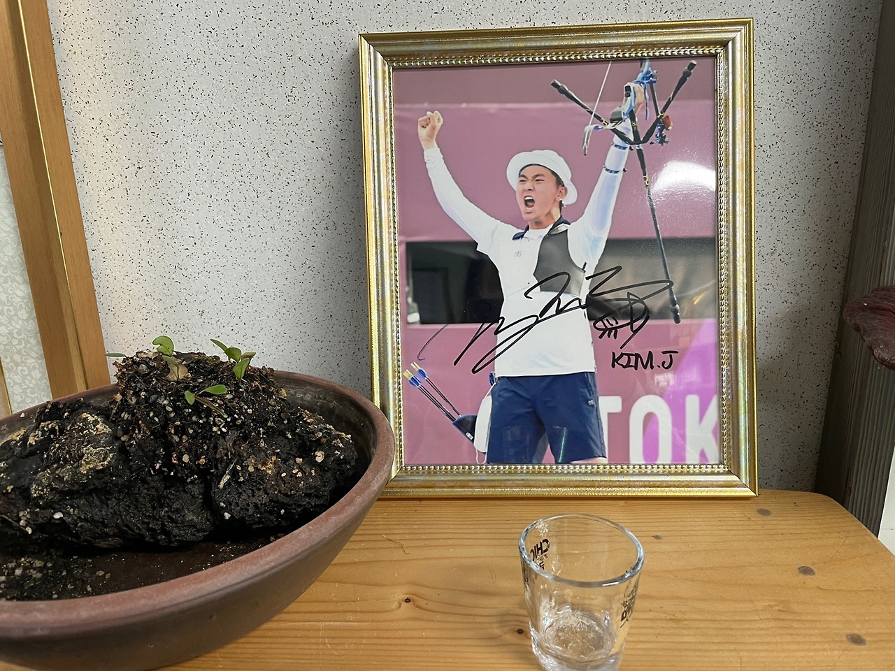 아무튼 무궁화 열차를 타고 예천역에 내려 근처 식당을 찾으니 '기사식당' 간판이 보여 찾아갔는데 문이 닫혀 옆에 있던 '예천손칼국수' 집으로 방향을 돌렸다. 손님 없는 한적한 식당에 문턱을 넘으니 양궁 고장답게 88올림픽 금메달리스트 김수녕선수의 사진과 양궁 모형의 액자, 그 옆에 소주잔이 놓여 있는 김제덕 선수 액자가 벽에 기대어 있었다. 식당 사장님이 김제덕 선수 찐 팬이신가보다 했는데 액자 앞에 놓인 소주잔을 궁금해 하며 그 옆에 벽에 걸려 있는 액자를 보니 식당 주인이 김제덕 선수 큰어머니시구나 했다.