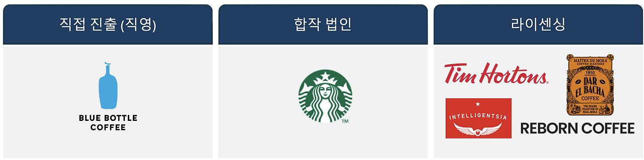 - 블루보틀 (미국): 블루보틀 커피 코리아 (Blue Bottle Coffee Korea) 법인 설립 후 직영으로 한국 매장을 운영 중에 있습니다.