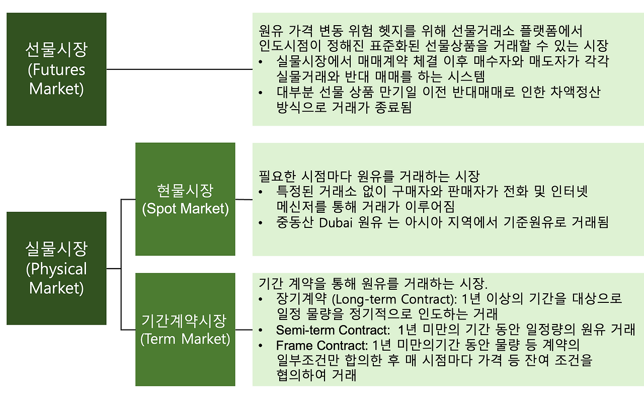 대한석유협회에 따르면 석유 거래 시장은 거래소의 유무에 따라 선물시장 (Futures Market)과 실물시장 (Physical Market)으로 나뉩니다. 실물시장은 거래 시점에 따라 현물 시장(Spot Market)과 기간계약시장 (Term Market)으로 나뉘며, 기간계약시장은 거래 기간 및 세부 계약 사항에 따라 장기계약 (Long-Term contract), Semi-term contract, Frame contract으로 나뉩니다.