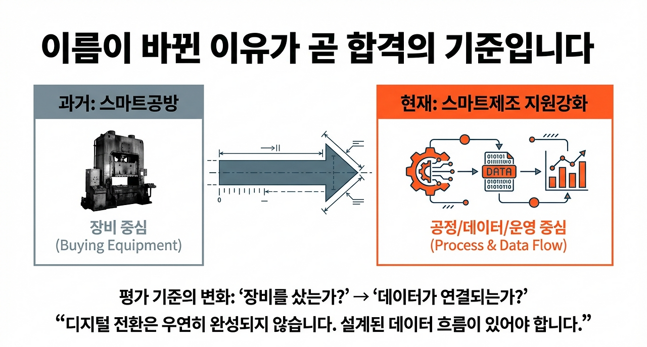 다만 공고에서 쓰는 표현은 ‘스마트제조 지원강화(구 스마트공방 기술보급)’처럼, 제조 공정 관점의 디지털화로 의미를 더 분명히 하는 흐름이다.